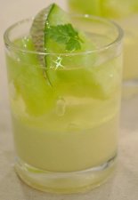 軽~いムース・サバイヨンに、柑橘&ミントで香り付けした白ワインのふるふるジュレと完熟メロン果肉ごろごろ。