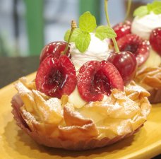パリパリのパイにたっぷりのカスタードクリームとアメリカンチェリー。クリームの中には甘酸っぱいグリオットチェリーのコンフィチュールが隠れています。