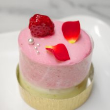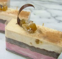 マンゴー&パッションのクーリ(果肉の入ったジュレ)が中に隠されたレア・チーズケーキです。