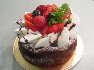 濃厚でほろ苦いガトーショコラにたっぷりの生クリームとイチゴとブルーベリー。