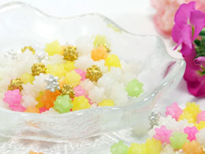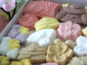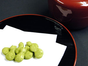 和三盆糖、落雁、生砂糖(きざと)、有平、押物、玉物のような乾いたお菓子をいいます。 主菓子の添え物としても使われ、見て楽しむことに力点がおかれています。お茶席ではおうすのお菓子として用いられます。 |
