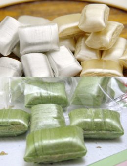 きな粉を加えた有平糖が金 きな粉を加えた有平糖が金色に、黒ごまを加えた有平糖が銀色に、抹茶を加えた有平糖は若草色の艶やかな飴になります。