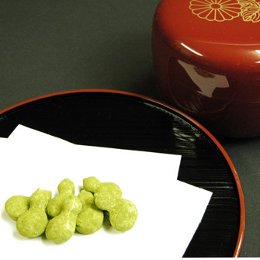 秀吉をイメージして、瓢箪の型をとり、京都・宇治のお抹茶をまぶしました。