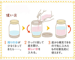 上下が開くキャニスターは使うときは上を開けて使い、中身を補充するときはひっくり返して下から入れるしくみ。そのあと使うときは、また上から使えば古いものが上になっているから、入れた順に使っていけるすぐれもの!透明で中身が見えるのも便利。
